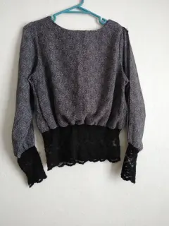 Blusa con encaje. Blusa delgada, talla chica con encaje en la parte baja y al final de mangas, cuello redondo y pliegues al frente, manga larga con detalles de dos aberturas a lo largo de la parte externa de las mangas, color negro con puntos blancos, muy fresca