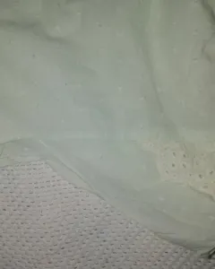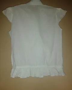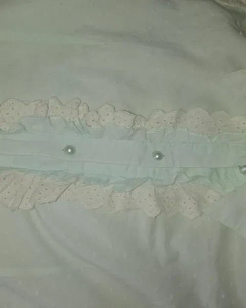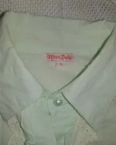 Blusa de botones tipo perla color menta con encaje en la parte de los botones y en las mangas, tiene elástico en la parte de la cintura. Detalles de uso: los botones vienen un poco flojos.