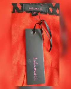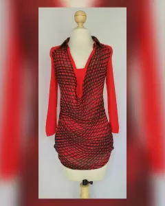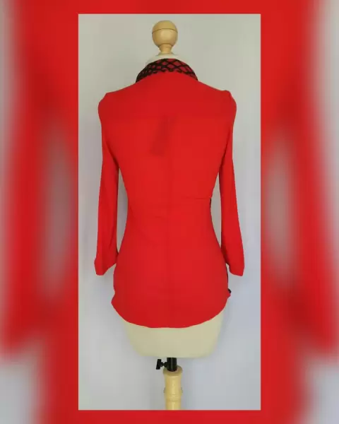 Blusa bitono ROJO FUEGO/NEGRO ÉBANO, c/ cuello clásico c/solapas y escote deapeado, tela estampada zona frontal y cuello, y manga 3/4. Talla M. Dimensiones cms: 35.5 hombro, 39 axila, 33.5 cintura, 50 zona baja, 73 largo, 52 largo manga. 72% poliéster, 25% algodón, 3% elastano. P/lavado en casa.***POR LA COMPOSICIÓN DE LA TELA ES LIGERAMENTE STRECH PERO NO PARA SUBIR A LA SIG TALLA***