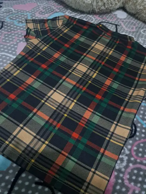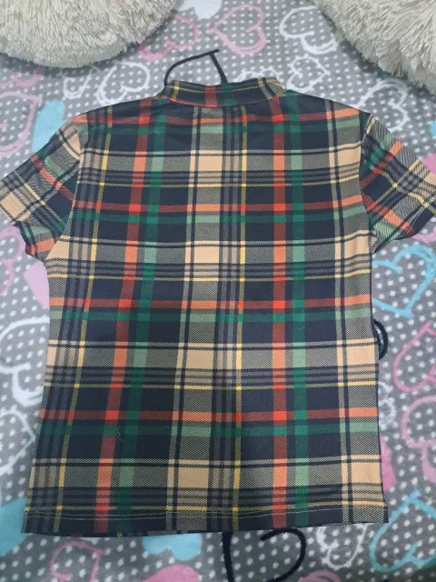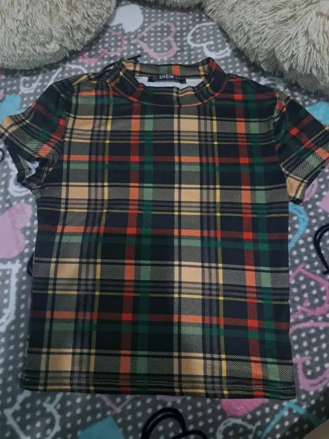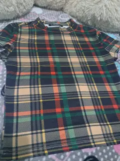 Blusa tipo licra con cuadros en tonos serios Entallada con cuello tipo tortuga pero corto.