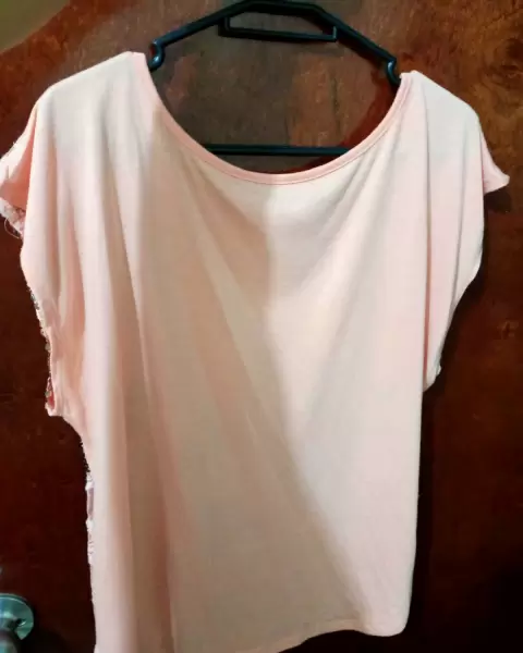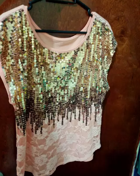 Blusa con lentejuela y encaje. Blusa talla m color melón con lentejuela y encaje por la parte de atrás lisa en perfecto estado