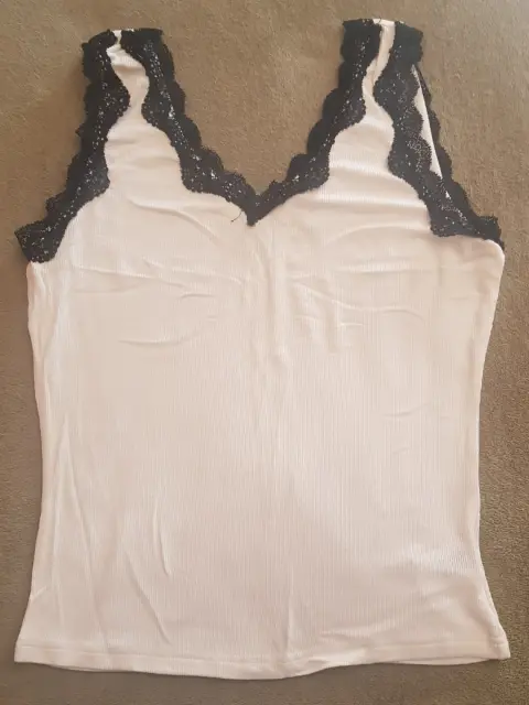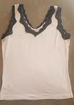 Fresca blusa sin mangas blanca, con detalle de encaje negro, tela súper suave.