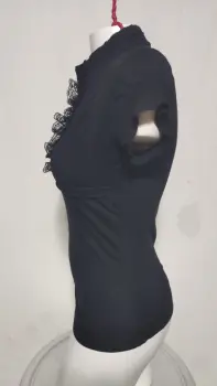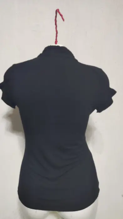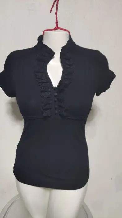 Blusa con olanes color negro 🖤. Linda blusa tiene coquetos olanes al frente los botones son funcionales están forrados, la tela es ligera y suave es strech, en perfectas condiciones..medidas: hombros-37cm./axila a axila-45cm./largo-62cm.