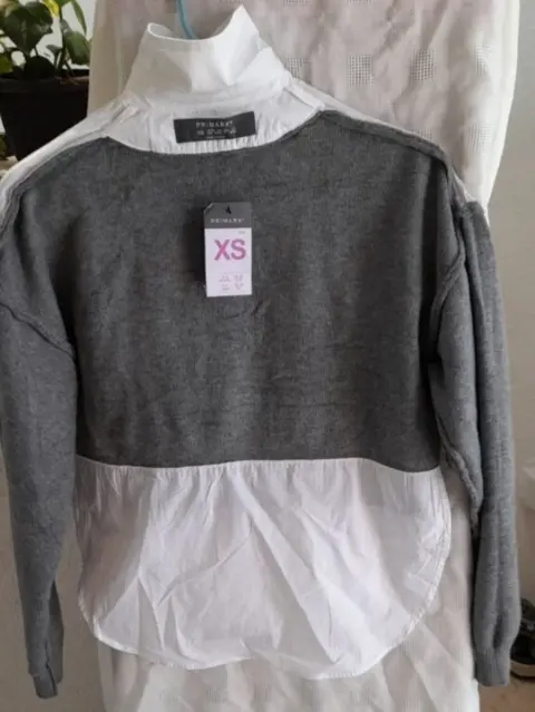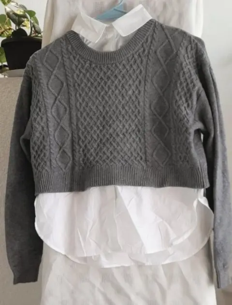 Linda blusa con sueter color gris oxford, es delgado el sueter,es nueva la prenda, talla,XS ,esta en buenas condiciones. Medidas,hombro a hombro-52, axila a axila-47, largo del sueter-33, largo manga-50,total del largo-53. Material poliester algodón.