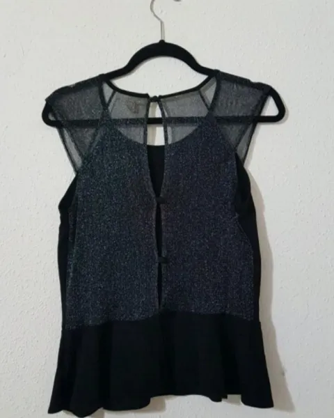 Blusa con transparencia plata brillos. Bonita blusa de vestir color negro, con escote y transparencia en espalda. la etiqueta dice talla L pero la verdad es que le queda muchisimo mejor a una talla M. viene algo reducida.