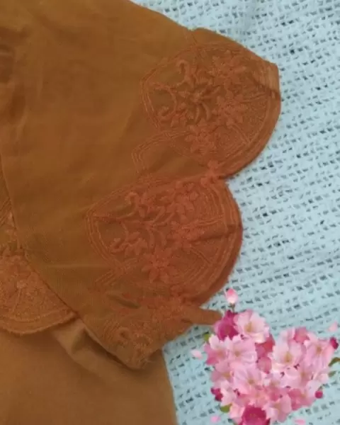 Blusa color naranja ocre con escote y mangas transparentes con hermosos bordados florales.