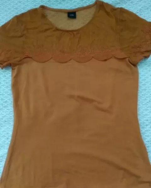 Blusa con transparencias y bordados. Blusa color naranja ocre con escote y mangas transparentes con hermosos bordados florales.