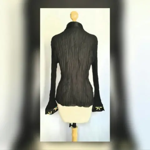 Blusa Corrugada con Aplique Madera. Blusa con transparencias y tela corrugada color negro, con cuello V con solapas, manga larga y apliques de madera emulando flores en zona frontal y puños. Talla XL (MUY REDUCIDA, DA MEJOR A M). Dimensiones: 44 cms hombro a hombro, 46 cms axila a axila, 34.5 cms cintura, 38 cms zona baja, 65 cms largo, 66 cms largo manga. 100% poliester. Para limpieza en casa. NUNCA SE USO PORQUE NO ME QUEDÓ.
