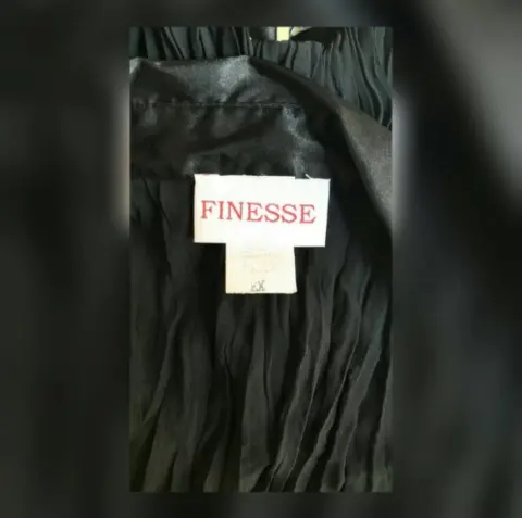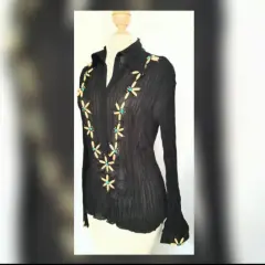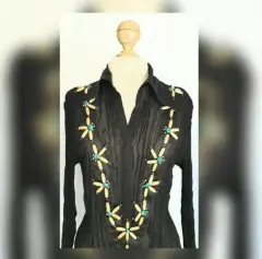 Blusa con transparencias y tela corrugada color negro, con cuello V con solapas, manga larga y apliques de madera emulando flores en zona frontal y puños. Talla XL (MUY REDUCIDA, DA MEJOR A M). Dimensiones: 44 cms hombro a hombro, 46 cms axila a axila, 34.5 cms cintura, 38 cms zona baja, 65 cms largo, 66 cms largo manga. 100% poliester. Para limpieza en casa. NUNCA SE USO PORQUE NO ME QUEDÓ.