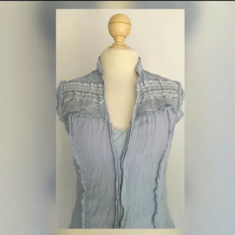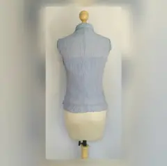 Blusa semi stretch color AZUL PIEDRA sin mangas, cuello Mao, con tank top desmontable, con encaje y listón azul en zona alta frontal, cierre mediante broches. Talla L (REDUCIDA, da mejor a talla S/M). Dimensiones cms: 35.5 hombro, 37 axila, 32 cintura, 46 zona baja, 58.5 largo, tank top: 41 axila, 40 cintura, 46 zona baja, 29.5 largo. 100% algodón. P/lavado en casa.***SIN DETALLES, SE USO SOLO UNA VEZ POR UN PAR DE HORAS***SE ENTREGA LAVADA Y DEDORIZADA***