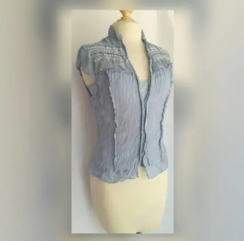 Blusa Corrugada con Tank Top. Blusa semi stretch color AZUL PIEDRA sin mangas, cuello Mao, con tank top desmontable, con encaje y listón azul en zona alta frontal, cierre mediante broches. Talla L (REDUCIDA, da mejor a talla S/M). Dimensiones cms: 35.5 hombro, 37 axila, 32 cintura, 46 zona baja, 58.5 largo, tank top: 41 axila, 40 cintura, 46 zona baja, 29.5 largo. 100% algodón. P/lavado en casa.***SIN DETALLES, SE USO SOLO UNA VEZ POR UN PAR DE HORAS***SE ENTREGA LAVADA Y DEDORIZADA***