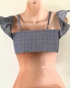 Blusa crop top, con moño al frente con tirantes delgados y volados en las mangas, es súper fresco e ideal para la temporada es de color gris con blanco negro y tallas azules.