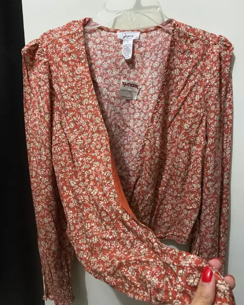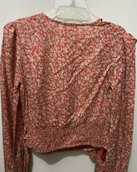Blusa cruzada. Hermosa blusa naranja con flores blancas de manga larga ( en los puños tiene elástico) y se abrocha cruzada, tiene un botónsito para amarrar en el escote. Nueva, queda a la cintura
