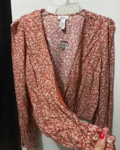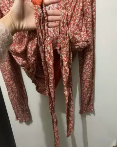 Hermosa blusa naranja con flores blancas de manga larga ( en los puños tiene elástico) y se abrocha cruzada, tiene un botónsito para amarrar en el escote. Nueva, queda a la cintura