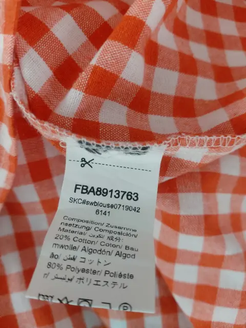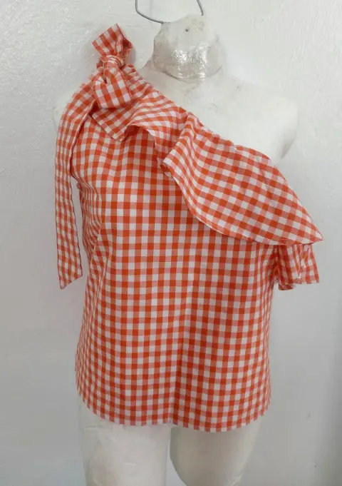 Blusa cuadros de un hombro. Bella blusita de un hombro con olan.Luce muy linda.No tiene strech.Talla STela 20% algodón y 80% poliéster.Sin detalles