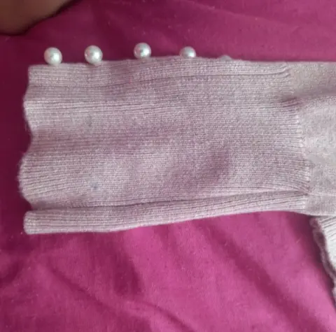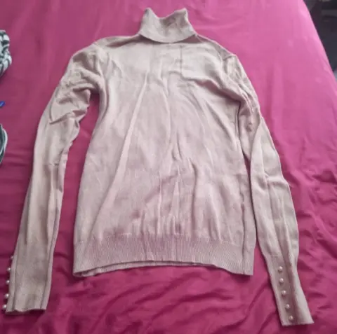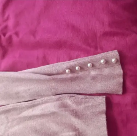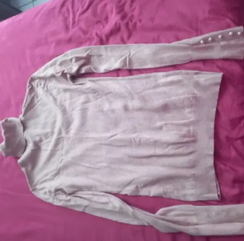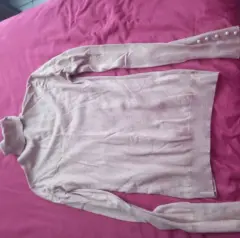 Blusa cuello de tortuga manga larga color rosa palo la tela no es tan caliente es fresca y comoda en las mangas tiene perlitas todas estan completas el cuello lo puedes modificar tiene el detalle de unas manchitas de tinta se aprecia en la ultima foto no perjudica mucho a la blusa casi no se logran ver.
