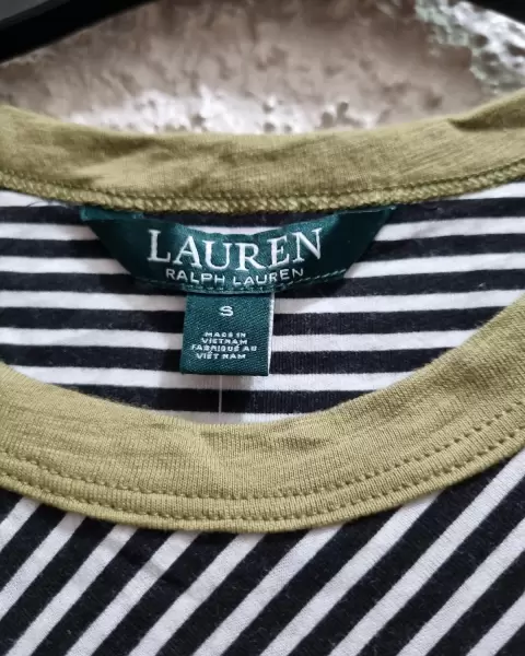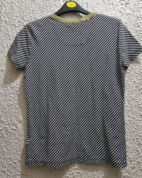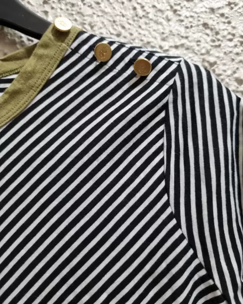 Blusa cuello redondo y manga corta de rayas negras con blanco y cuello verde militar en el hombro trae tres botones de adorno grabados con el logo de la marca 100% original