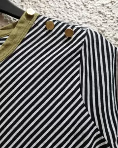 Blusa cuello redondo. Blusa cuello redondo y manga corta de rayas negras con blanco y cuello verde militar en el hombro trae tres botones de adorno grabados con el logo de la marca 100% original