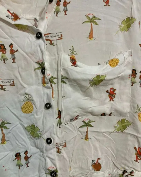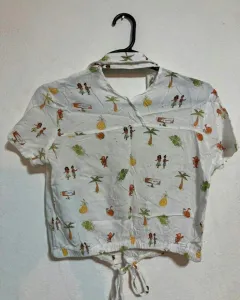 Blusa tipo camisa, con botones y listón ajustable en la parte de abajo, manga corta y una bolsa delanteraDetalle abierto debajo del cuello en la parte de atrás