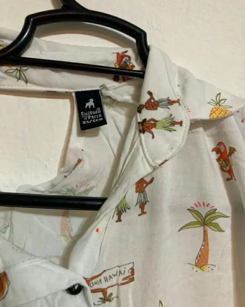 Blusa cuidado con el perro. Blusa tipo camisa, con botones y listón ajustable en la parte de abajo, manga corta y una bolsa delanteraDetalle abierto debajo del cuello en la parte de atrás