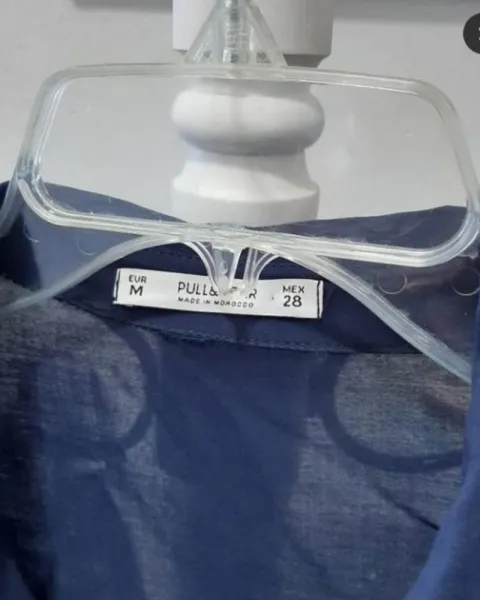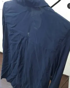 Blusa de botones azul marino, talla M, manga larga, sin detalles.