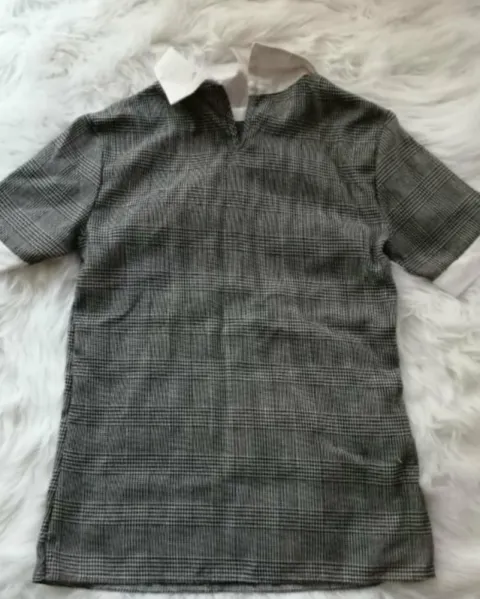 Blusa de cuadros manga corta color gris. El cuello es de camisa color blanco esta blisa está ajustada