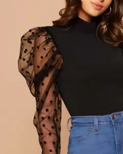 Blusa de cuellos alto con manga tipo Gigot transparente y abombadas a la altura de los hombros, súper elegante.