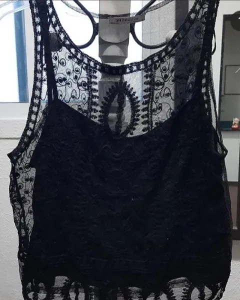 Blusa de encaje negra. Blusa Zara transparente de hombros descubiertos, tiene su blusita de tirantes abajo, sin detalles.