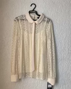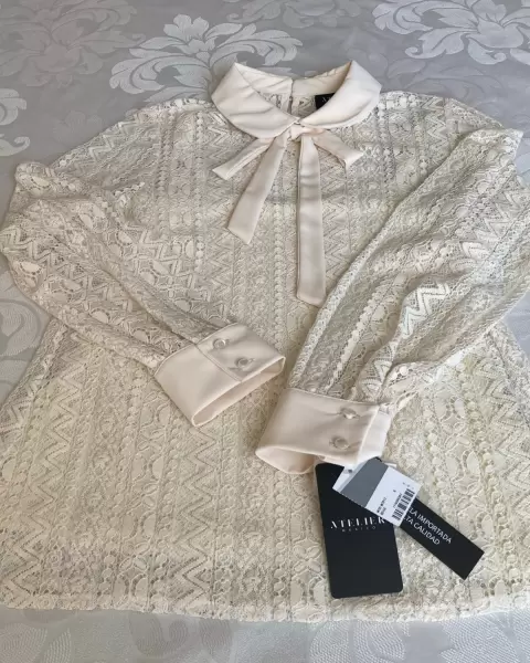 Hermosa blusa de encaje, color hueso, 65% algodón, 49 cm de axila a axila y 62 cm de largo manga larga, nueva