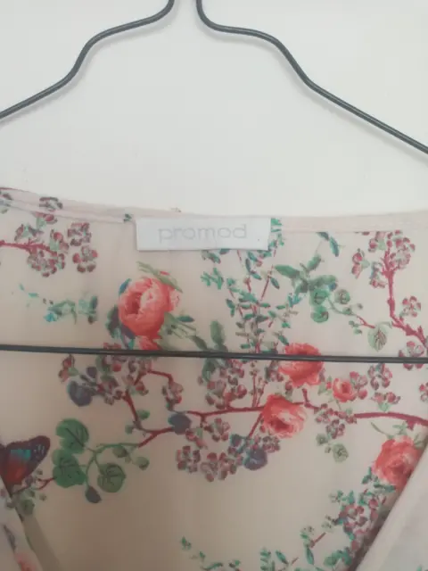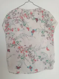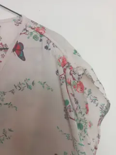 Blusa de escote V con estampado. Blusa con estampado de flores y mariposas, cruzado enfrente y fruncido en la parte del hombro, de tela fresca