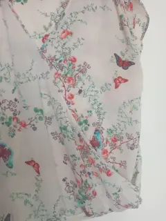 Blusa con estampado de flores y mariposas, cruzado enfrente y fruncido en la parte del hombro, de tela fresca