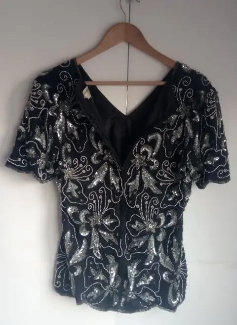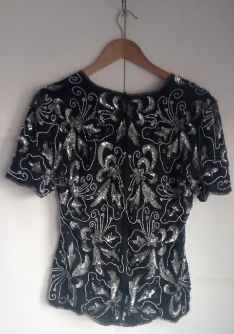 Blusa color negro, con bordados de chaquira y lentejuela en toda la prenda, talla chica, con cierre en espalda, largo a la cintura, la tela no estira, sin defectos