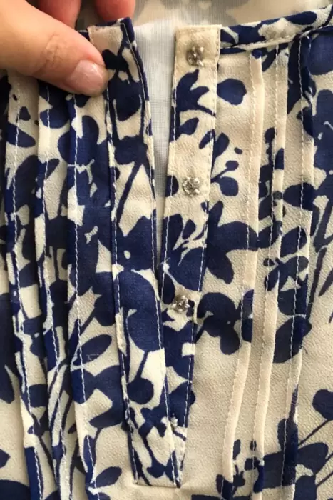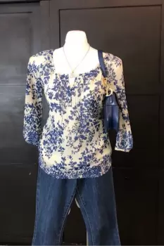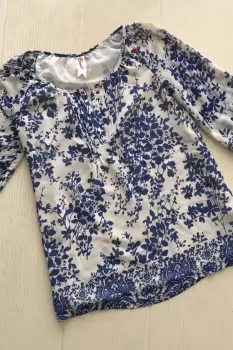 Blusa en tono beige con flores viene con brochesitos al frente y manga 3/4, el estilo es con forro debajo y encima la tela es semi transparente como shiffon.Medidas:Hombro a hombro: 43 cmAxila a axila: 45 cmLargo: 70 cm