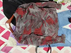 Blusa de gasa, print de hojas (naturaleza muerta) en tonos rojo quemado y gris. Transparenta, tela rígida, ligera, fresca y delicada. Muy bonita 😍 Talla 5