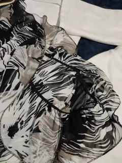 •Te interesa? Escucho ofertas•Deseas varias prendas? armo tu paquete✨Preciosa blusa de gasa con print estilo naturaleza muerta en tonos negro, café y blanco. Transparenta, tela delicada. Escote en V con olanes. Luce muy linda para llevar a la oficina. 😊