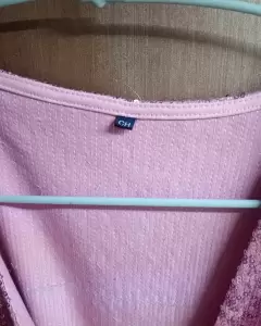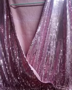 Blusa de lentejuelas rosas, tiene un broche en el pecho para cerrar el escote.Es talla S pero viene amplia.