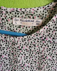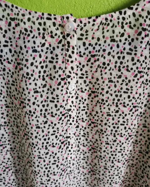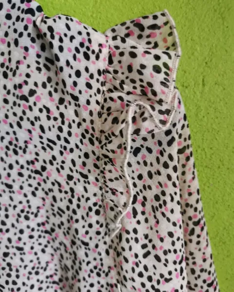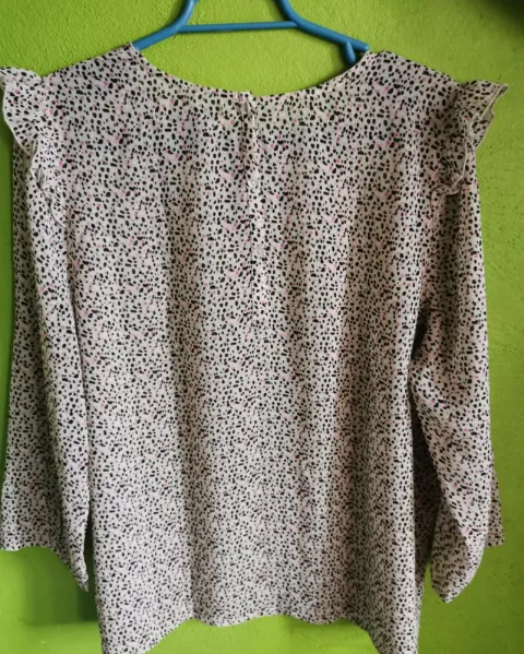 Blusa de manchitas negras y rosas. Bonita blusa de transparencias, cuenta con unos planes en los hombros, es talla L y esta en excelente estado