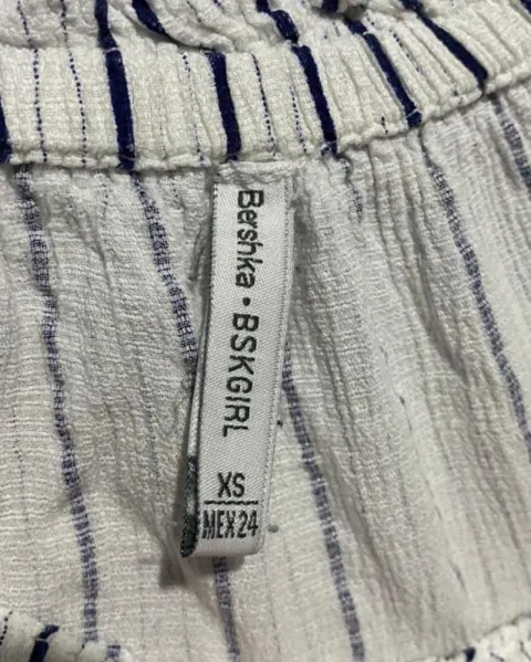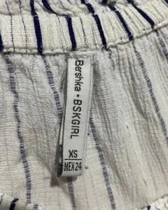 Blusa de mangas al hombro, solo en esa parte con resorte, color blanco con rallas azul marino, sin detalles de uso.