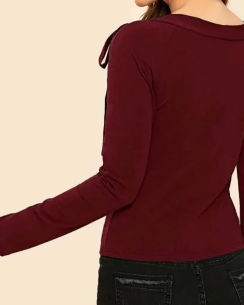Blusa De Mujer Nudo Delantero Ajustable. Blusa De Mujer con Nudo Delantero con diseño de Abertura, estilo elegante, cuello redondo, manga larga, es ajustable, color vino, talla L, tiene una sola puesta por lo que se encuentra prácticamente nueva, se puede lavar en lavadora