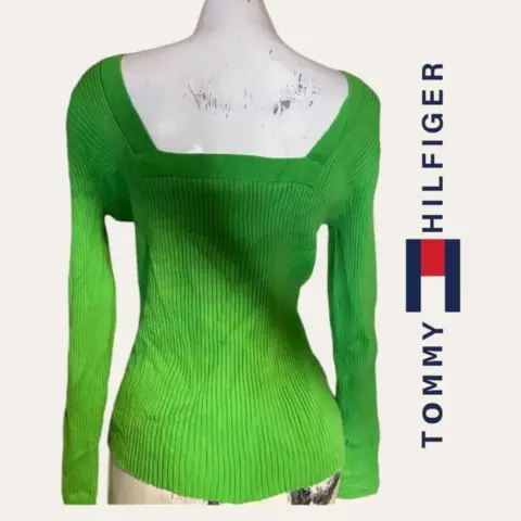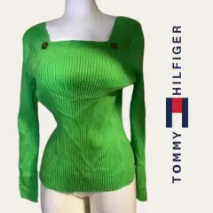 Blusa de punto verde limón Tommy Hilfiger L. Blusa verde Tommy Hilfiger t L escote rectangular botones grabados de la marca bandera de la marca en costura lateral izquierdo, material 76% algodón 24% nylon. 42cm hombros 41cm axila a axila 59cm largo