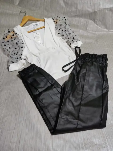 Blusa de puntos, pantalón de vinipiel. Blusa de puntos, en talla ch, M, G, y pantalón negro de vinipiel jogger, talla ch, M, G