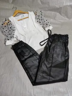 Blusa de puntos, en talla ch, M, G, y pantalón negro de vinipiel jogger, talla ch, M, G