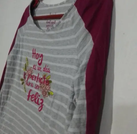 Es una prenda súper moderna y con estilo. Las rayas le dan un toque clásico, mientras que la frase en el medio le agrega un toque divertido y único. ¡Sería perfecta para lucir a la moda y expresar tu personalidad! 😊👕✨