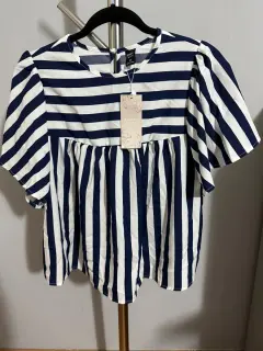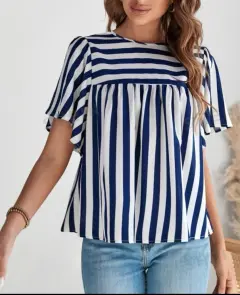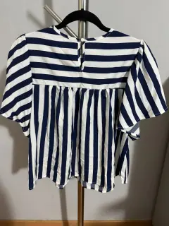 Blusa de rayas azul marino con blanco, manga mariposa, etiquetada como xs, viene un poco amplia