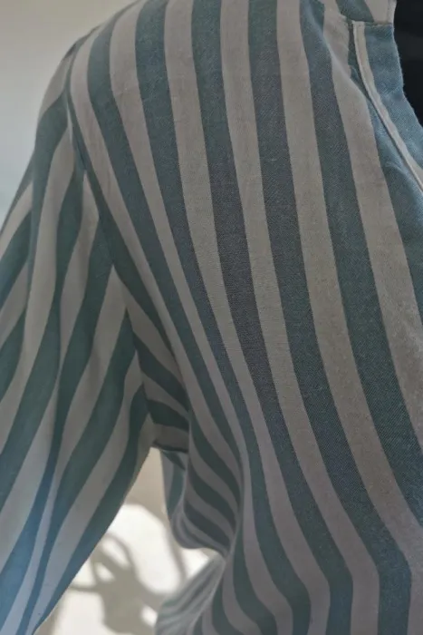 Blusa de rayas blanco con azul claro, escote en V botones al frente, corte holgado