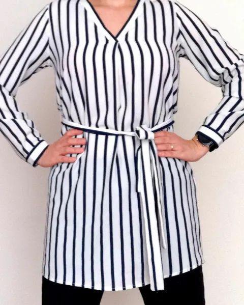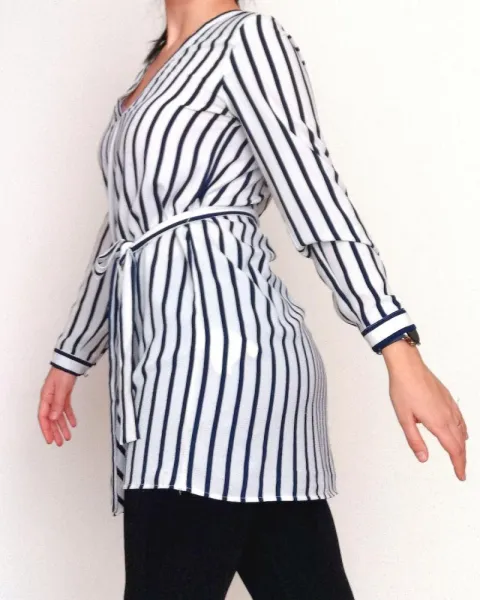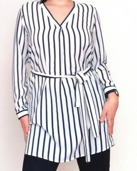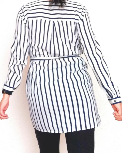 Blusa de rayas talla chica. El único detalle es una pequeña marca de maquillaje que no le pude quitar, ver última foto.Fuera de eso está en buen estado y se ve muy linda sobre todo para ir a la oficina o alguna ocasión formal :)Si tienes dudas te ayudo!!