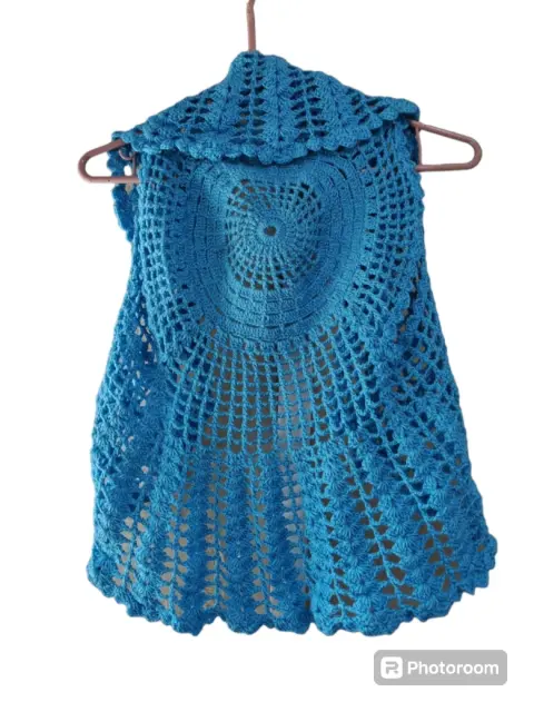Blusa de tejido para Dama en color azul con cuello, se puede usar abierto y cerrado, talla mediana, sin marca.