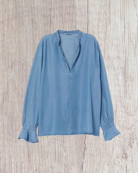 Blusita H&M Tencel en tela de color mezclilla con olanes en las mangas, totalmente nuevecita y va con todo y etiquetas
