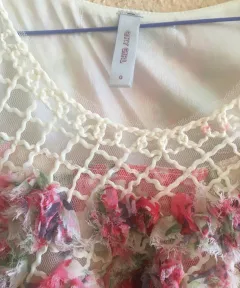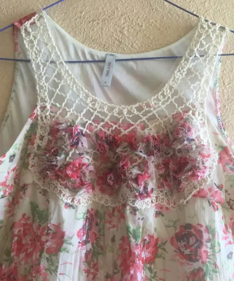 Bonita blusa de tirantes, tela tipo tul, tiene un forro abajo para que no se transparente, se ve arrugadita pero así es la tela, esta en buen estado, no esta rota, ni deshilada, ni manchada. Talla G.