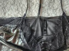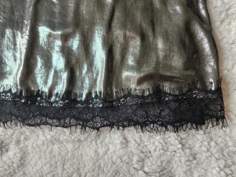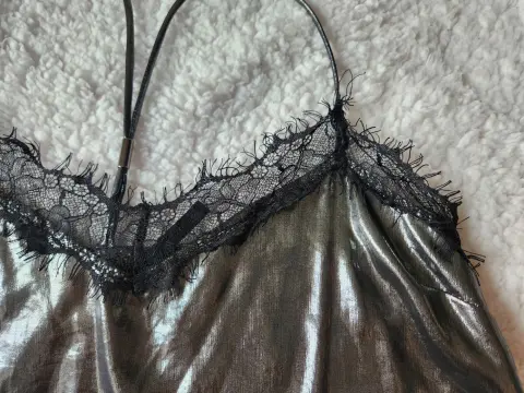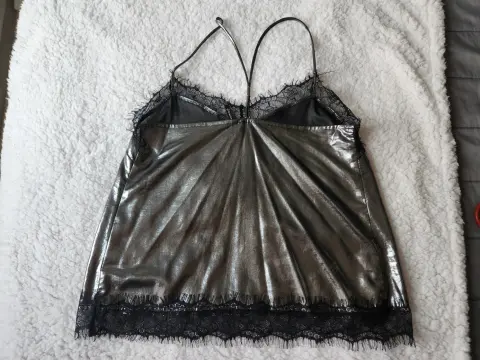 Blusa de tirantes, color girs de tela metalizada ligera, con encange negro en parte del pecho y lanparte baja.